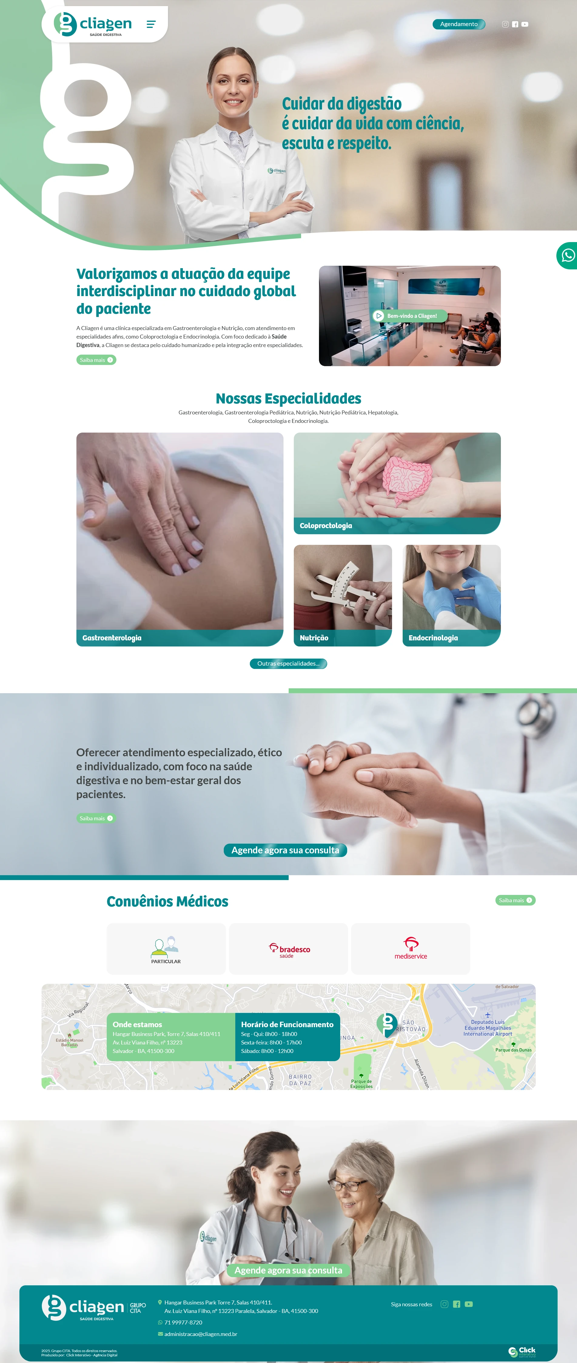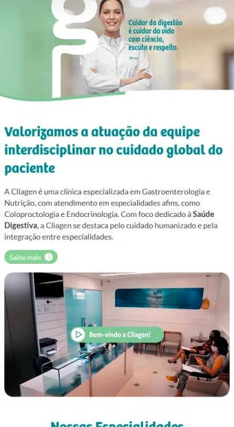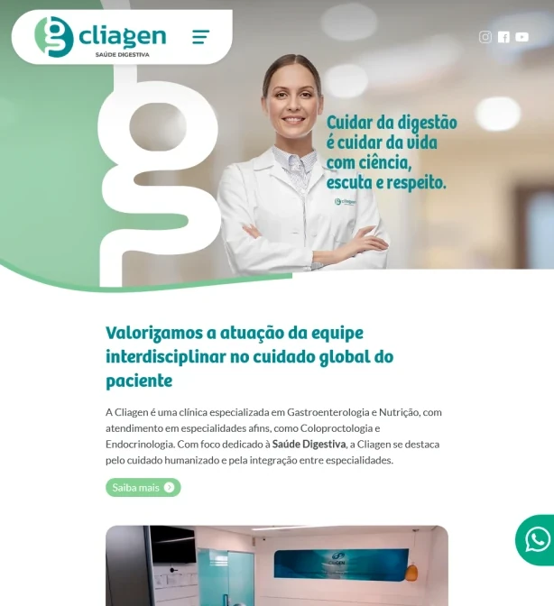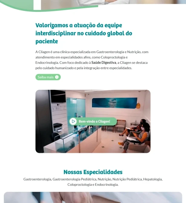 Na Click Interativo, desenvolvemos soluções digitais que reforçam a presença online de instituições voltadas ao cuidado com a saúde e a experiência do usuário. Tivemos o orgulho de criar o site da Cliagen, uma clínica especializada em gastroenterologia, nutrição e outras especialidades médicas, com foco em atendimento humanizado e excelência clínica.