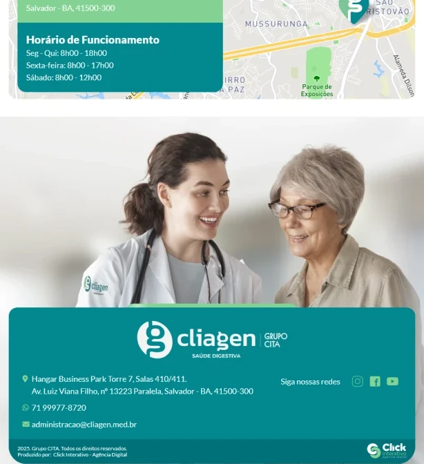 A Cliagen é uma clínica de atenção em gastroenterologia, especialidades médicas e nutrição localizada em Salvador. Com foco na saúde digestiva e no bem-estar dos pacientes, conta com uma equipe multidisciplinar altamente qualificada e oferece atendimentos personalizados para adultos e crianças.