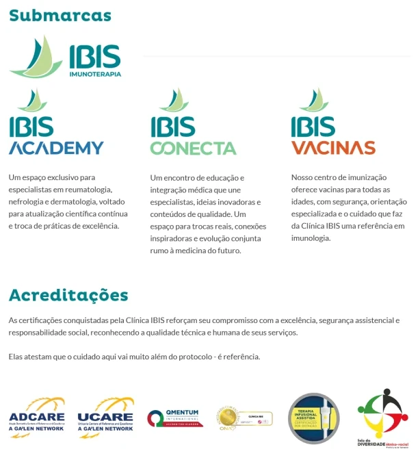 A Clínica Ibis é um centro de saúde especializado em imunoterapia e atendimento em áreas como reumatologia, dermatologia, gastroenterologia, neurologia e alergologia, com foco em atendimento humanizado e de alta qualidade técnica. A clínica também conta com serviços de vacinação e um centro de pesquisas clínicas preparado para estudos nacionais e internacionais.